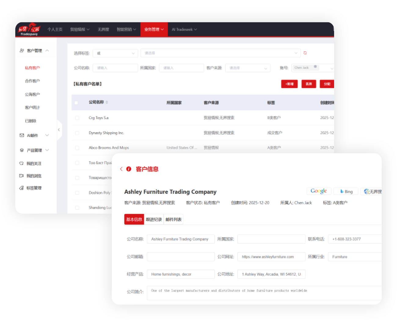 无缝整合海关交易、企业社媒、地理地图数据,绘制360°客户全景画像。