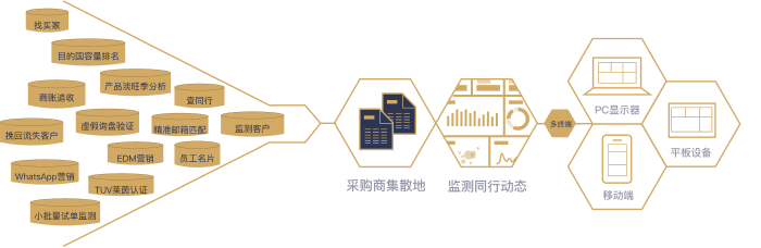 传统外贸B2B模式,允许用户上传企业介绍、产品资料、360展现企业概况和联系方式、广告推广、坐等询盘。